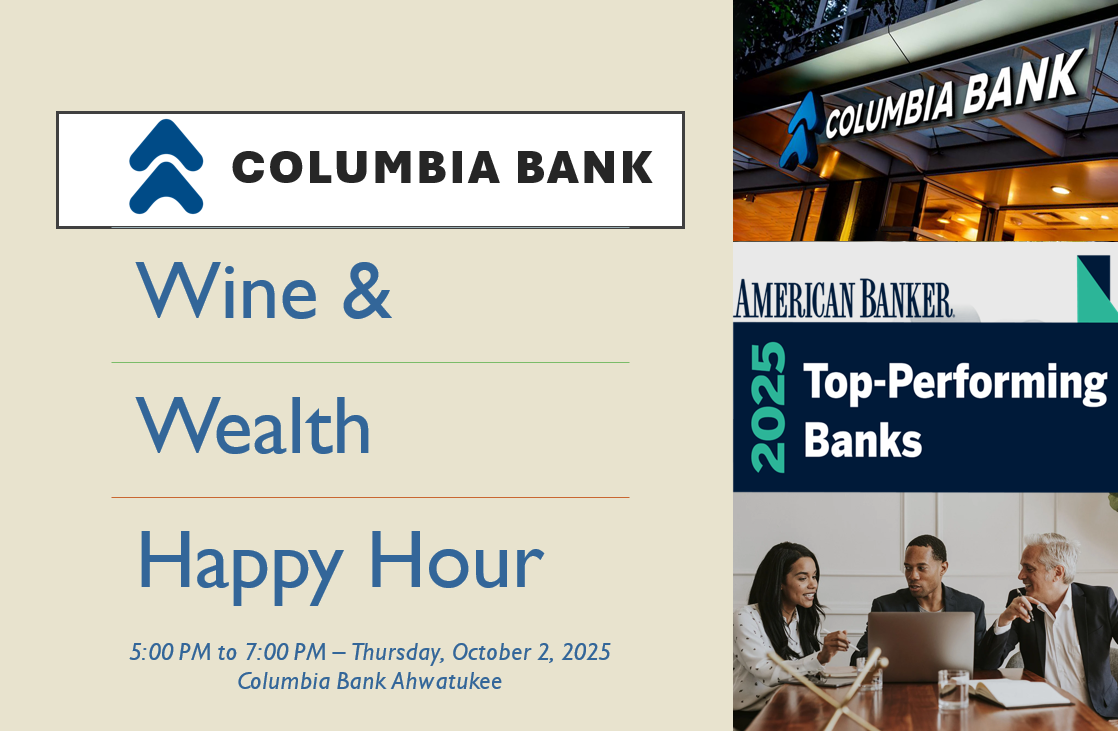 Welcome to Columbia Bank Ahwatukee! Please stop by and join us for a Wine & Wealth Happy Hour, meet some of Ahwatukee's Business Leaders and Entrepreneurs. Let's make talking about, managing, and building wealth as fun as talking about wine.